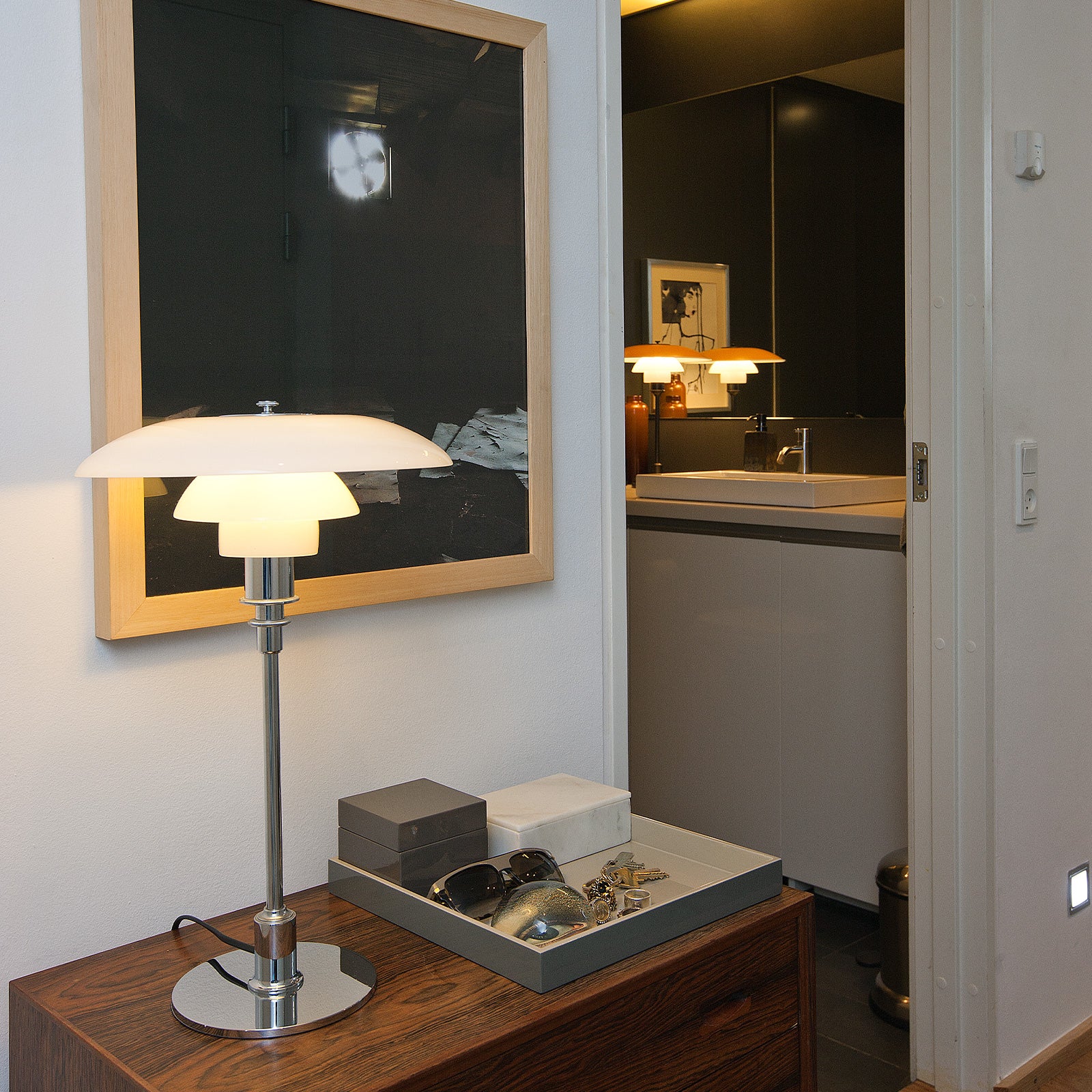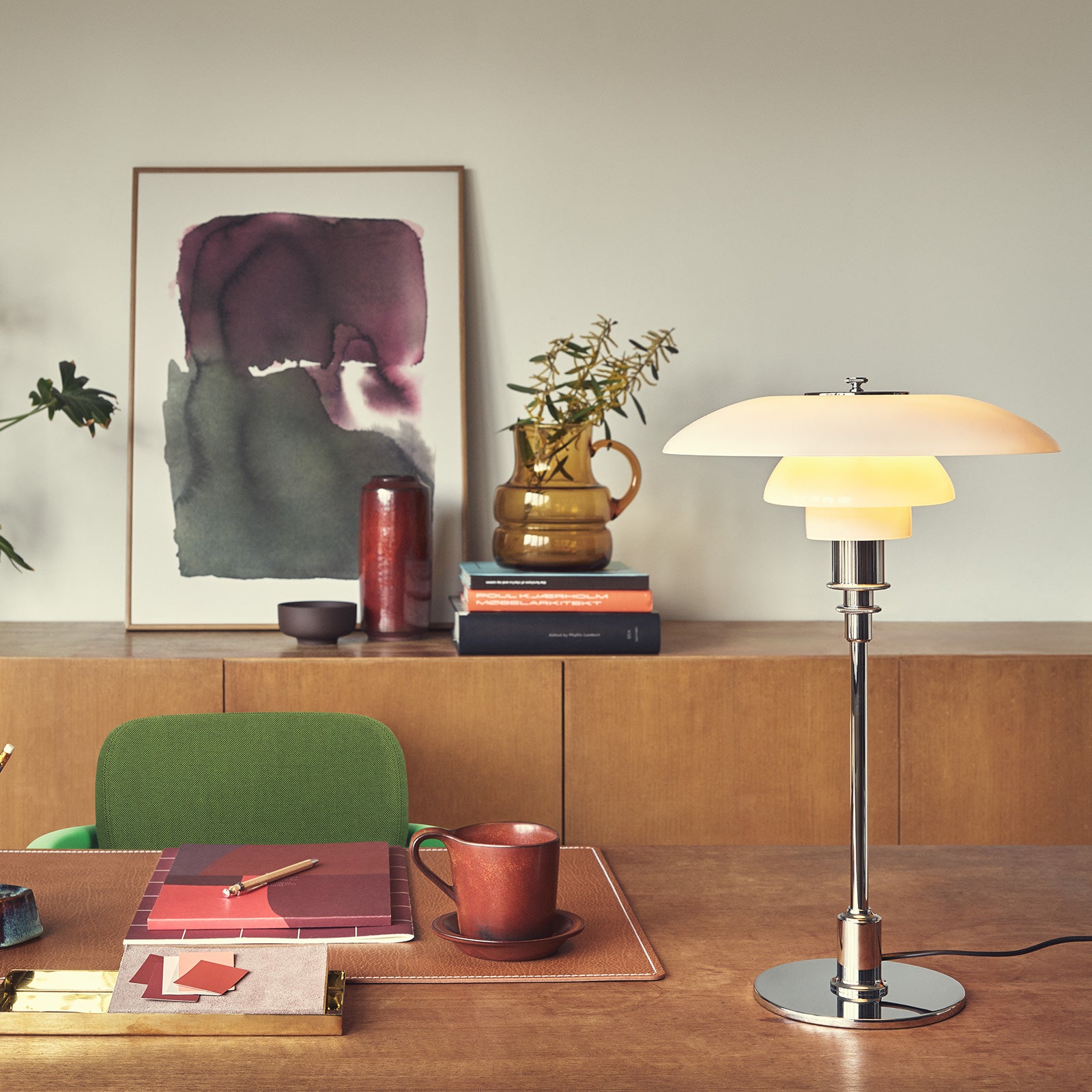 1928年にデザインされた PH 3 ?-2 ? グラス テーブルランプは、ポール・ヘニングセンが1926年に完成させその後世界的に有名となった3枚シェードシステムに基づいています。