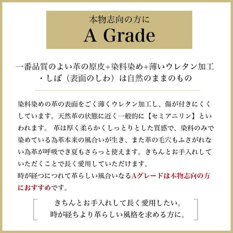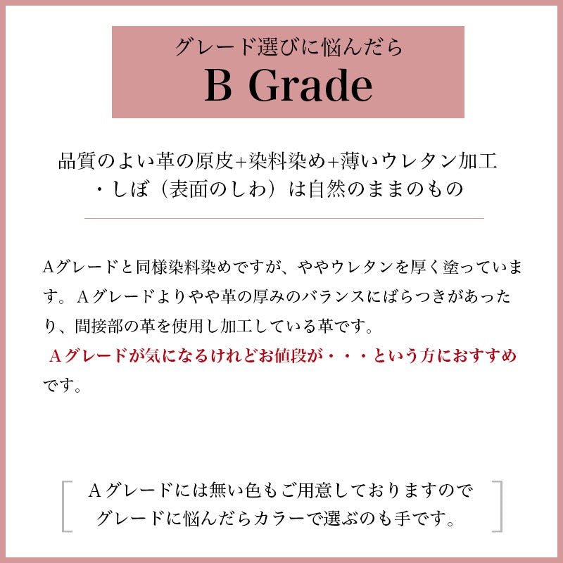 Aグレードよりやや革の厚みのバランスにばらつきがあったり、 間接部の革を使用し加工している革。Aグレードには無い色もあります。