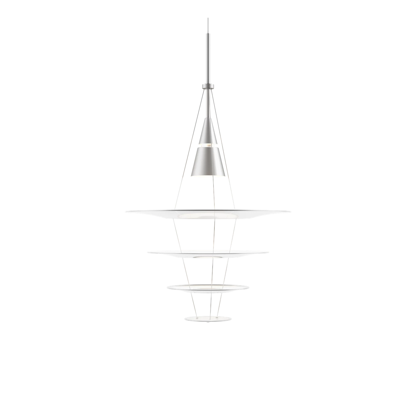 極細ワイヤーで吊られた複数のシェードが浮遊する軽く透明感のあるスタイルは、ルイスポールセンのデザイン・フィロソフィーと一致するばかりでなく、眩しさを遮る複数シェードシステムの新たな解釈であり、日本の優雅な美とスカンディナヴィアの簡素性の融合です。